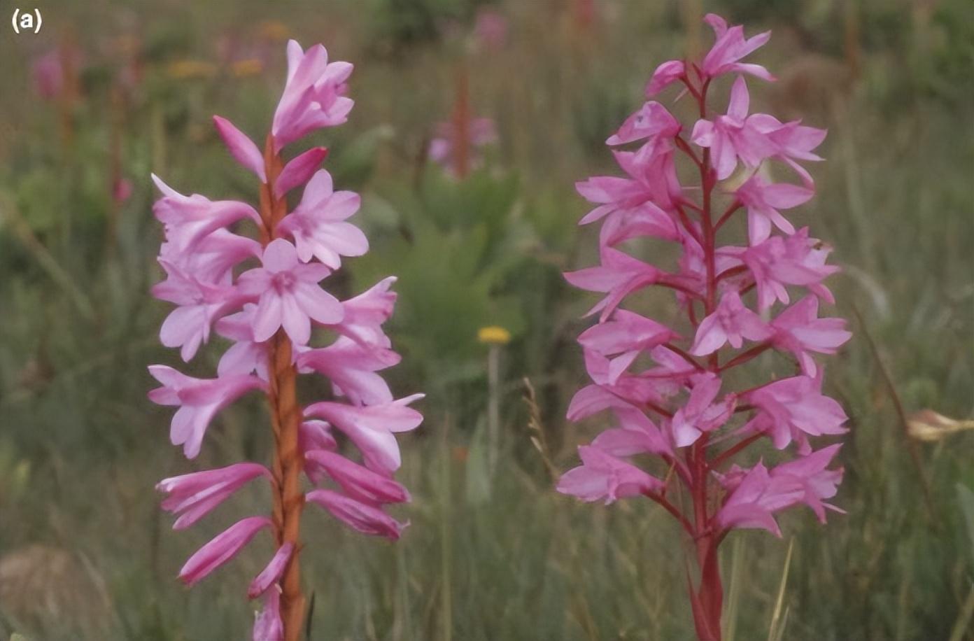 南非的無報酬蘭花Disa pulchra和鳶尾科植物Watsonia lepida對比