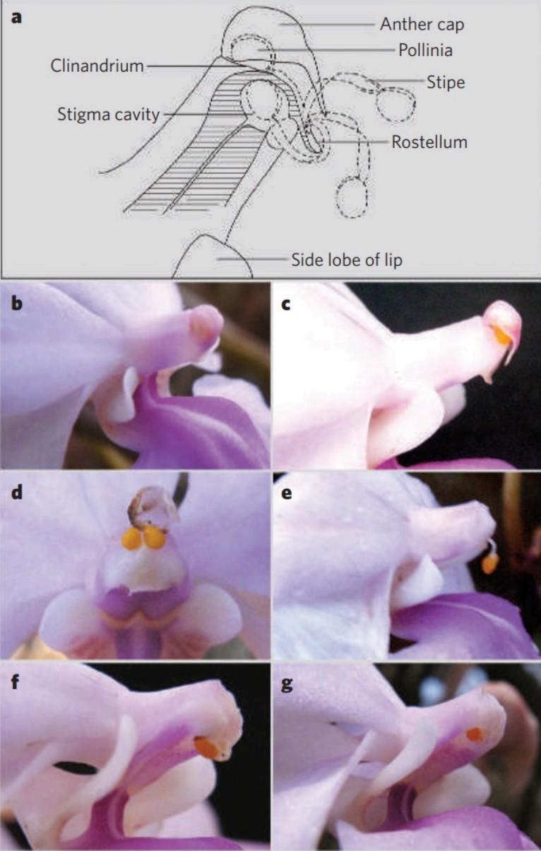 a. 花粉從花葯運輸到柱頭過程中花部結構的排列及其運動(虛線)(在 c-g 中描述);b. 授粉開始前開放的花朵;c. 花葯帽打開並從蕊柱上脫落;d. 花絲頂端攜帶兩個花粉塊上升;e. 向下彎曲穿過蕊喙;f. 花絲接着向上朝柱頭彎曲;g.將花粉塊插⼊柱頭腔