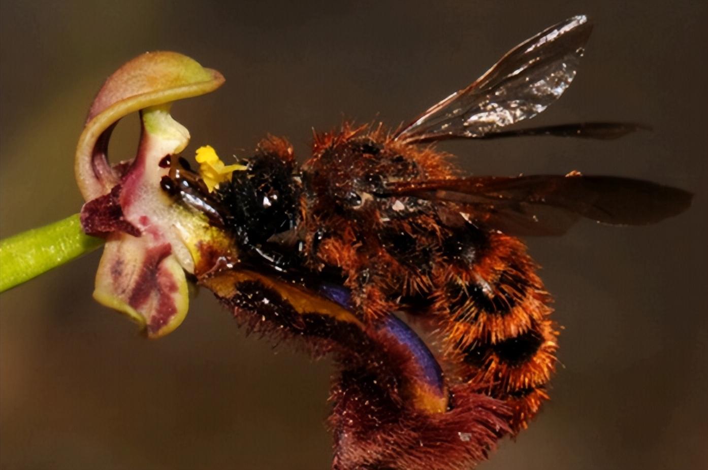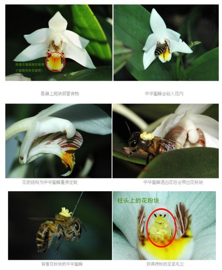 脣瓣(修飾的花瓣)是蘭科植物其最顯著的特徵之一,可以吸引昆蟲併爲其提供採蜜時的“着陸平臺”。發現自己脣瓣優勢的蘭科植物,不斷放大自己的優勢,在脣瓣的形態、顏色、氣味等方向發力創新。部分蘭科植物(約有1/3)通過模擬、僞裝等手段,誘騙傳粉者爲它們傳粉,比如足莖毛蘭(Eria coronaria)利用脣瓣上的黃色斑塊模擬成美味的食物,吸引饞嘴的中華蜜蜂的光臨。
