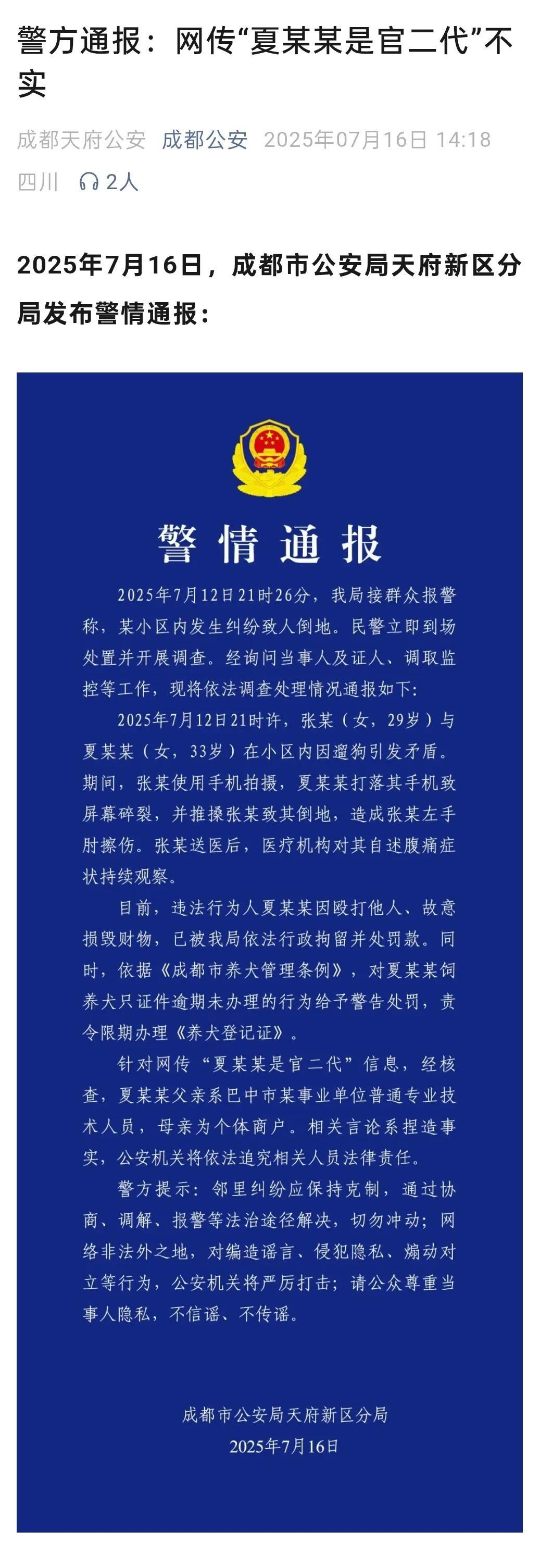7月16日,成都市公安局天府新區分局通過微信公衆號“成都天府公安”發佈警情通報稱,張某(女,29歲)與夏某某(女,33歲)在小區內因遛狗引發矛盾。期間,張某使用手機拍攝,夏某某打落其手機致屏幕碎裂,並推搡張某致其倒地,造成張某左手肘擦傷。張某送醫後,醫療機構對其自述腹痛症狀持續觀察。