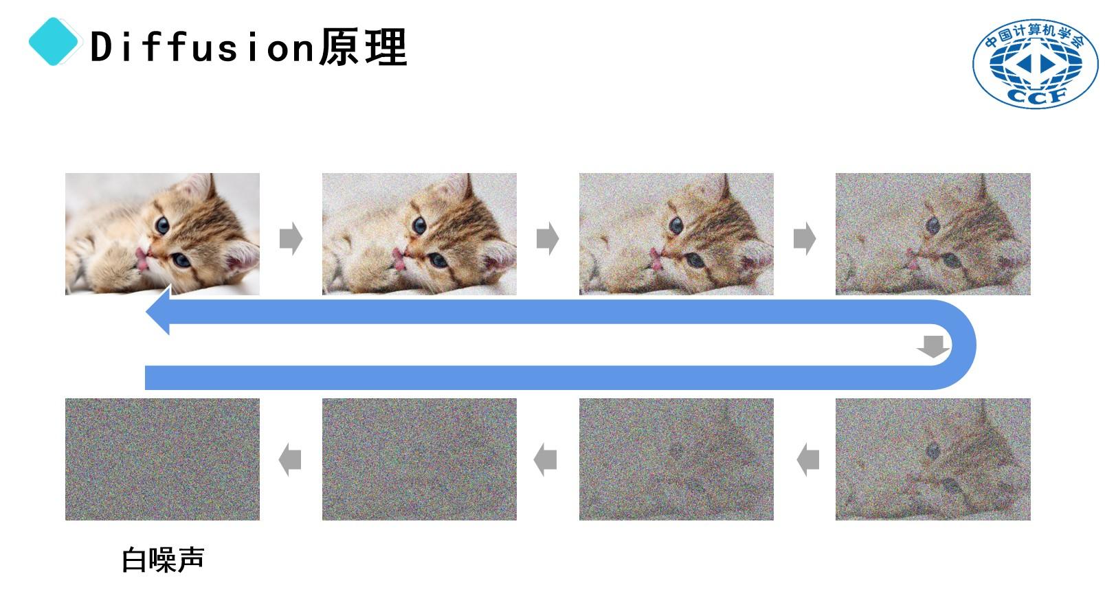 以一張小貓的圖片爲例。首先,我們可以通過向圖片中添加隨機像素(即噪點),使其變得模糊不清。隨着噪點數量的增加,圖片將逐漸失去原有的細節,最終呈現出類似電視信號不佳時出現的雪花狀畫面。這種完全隨機的像素分佈被稱爲“白噪聲”。