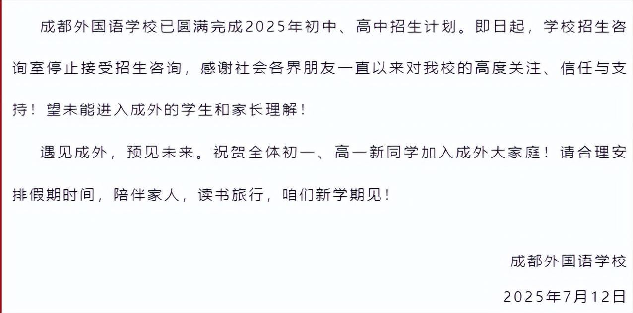 其中,成都外國語學校(以下簡稱“成外”)在7月6日發佈的“2025年小升初空餘計劃公告”顯示,學校有257個空餘學位,全成都市符合條件的學生均可報名。就在該補錄計劃發佈後不久,一篇主題爲《天價學費嚇退家長,補錄257人沒人報,成都外國語學校跌落神壇》的文章在互聯網出現,上百個網絡賬號在多個網絡平臺同時發佈。對此,成外公開數據予以駁斥,數據顯示,成外初中第一輪招生,共1893名學生報名,搖中率37%;257個補錄計劃,報名補錄的學生829名,搖中率31%,比第一輪的搖中率還要低,不存在“沒人報”的情況。