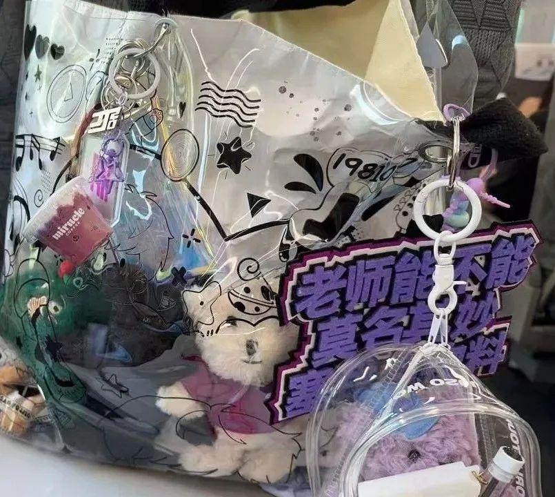 追星、追戲劇的羣體則盛行文字掛牌。這種掛牌如同包袋上的鮮豔彈幕,用歌詞或彼此之間心領神會的“梗”來辨別屬於自己的羣體。與人物形象不同,文字掛牌因爲可讀性強,還可以承載不同的功能。