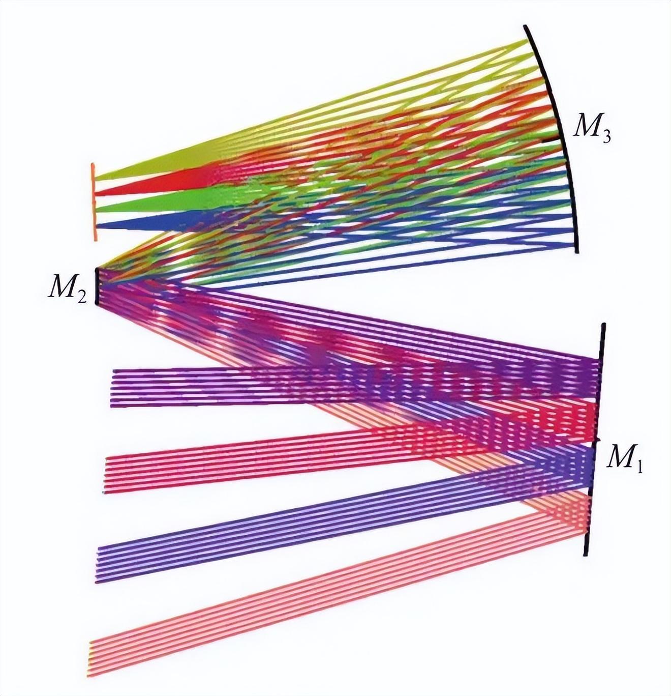 這種“魚與熊掌兼得”的奧祕藏在離軸三反光學系統的非對稱結構裏。離軸三反光學系統能夠打破傳統同軸系統旋轉對稱性的幾何束縛,將主鏡傾斜、次鏡與三鏡離軸偏置,形成非對稱光路。這種幾何排布不僅能夠徹底消除次鏡的中心遮攔,使入射光線得到 100%利用,提高了光學系統的分辨率,還賦予光學設計更多的調控維度——設計師可獨立優化每片鏡子的傾角、離軸量與曲面參數,爲像差校正開闢全新路徑。