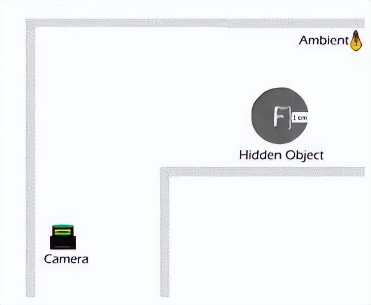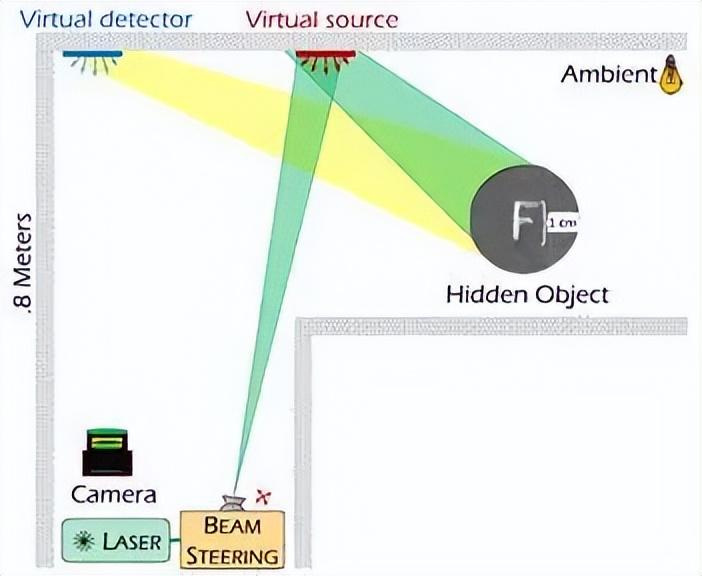 爲了達到目標,有研究者腦洞大開,提出了這樣一種方式,堪稱大數定律的進階應用。在相機旁邊安裝一個激光發射器,激光發射器把光束髮射到牆上紅色位置,然後反射光照到物體上,之後物體再把光束反射到牆上的藍色位置,然後相機就可以拍攝下來了。