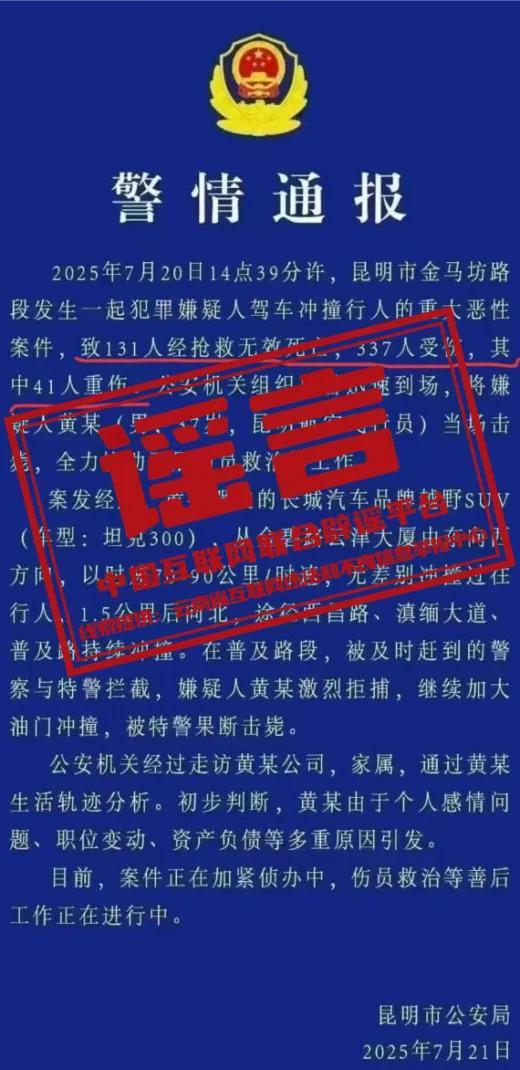 詳情:近日,一則內容爲“昆明市金馬坊路段發生一起犯罪嫌疑人駕車衝撞行人的重大惡性案件,致131人經搶救無效死亡,337人受傷,其中41人重傷”的“警情通報”在網上流傳,引發社會關注。經覈實,該“警情通報”系謠言。真實情況是:7月20日13時16分,雲南省昆明市西山區金碧路發生一起道路交通事故。經昆明市公安局查實,李某某(男,49歲,昆明市西山區人)駕駛一輛藍色小型越野車行駛至金碧路時,撞上正常行駛的電動自行車及行人,隨後駕車逃逸途中又與其他車輛及行人發生碰撞。事故共造成2人死亡,4人輕傷,5人輕微傷,受傷人員已送醫院救治,無生命危險。目前,公安機關已將李某某抓獲,已排除酒駕、毒駕嫌疑。初步查明屬交通肇事逃逸,事故正在進一步調查處理中。(來源:“網信雲南”微信公衆號)
