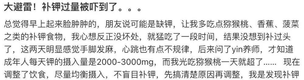 也有人說身體缺鉀,會出現倦怠的症狀,比如早上起來感覺疲勞、睏倦,臉也腫腫的,此時就應該多補鉀。結果一通亂補,感覺手腳發麻,心跳也不規律。