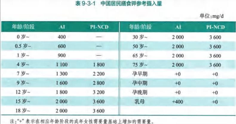 預防非傳染性慢性病的建議攝入量(PI-NCD)是以非傳染性慢性病如肥胖、糖尿病、高血壓、血脂異常、腦中風、心肌梗塞以及某些癌症等的一級預防爲目標,提出的必需營養素的每日攝入量。也就是說爲了預防這些慢性病的發生,鉀的攝入量應該達到 3600 毫克/天。