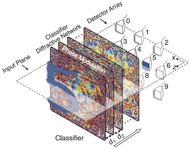 在下圖中名爲“光衍射神經網絡”的系統中,當輸入平面不同位置的光強弱分佈表示不同數字的圖案時,在系統另一側的輸出端,光經過優化設計的一連串衍射光學器件調製後,能夠按照數字的不同會聚到不同位置,光指到哪裏就告訴我們數字是哪一個,會直接顯示出數字分類識別的結果。