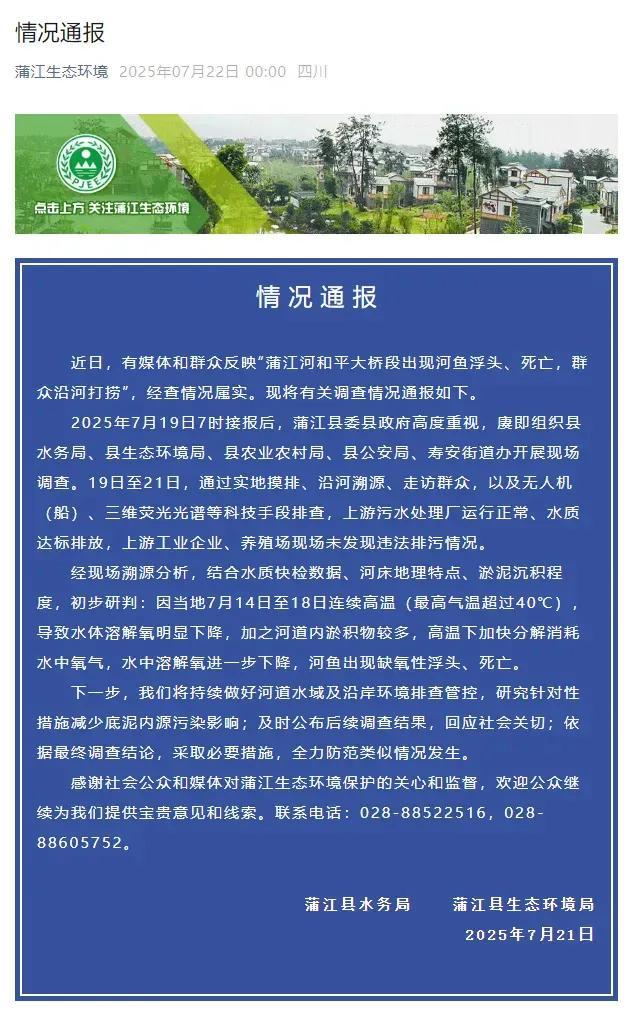 詳情:7月21日,四川成都蒲江縣水務局、蒲江縣生態環境局發佈情況通報稱: