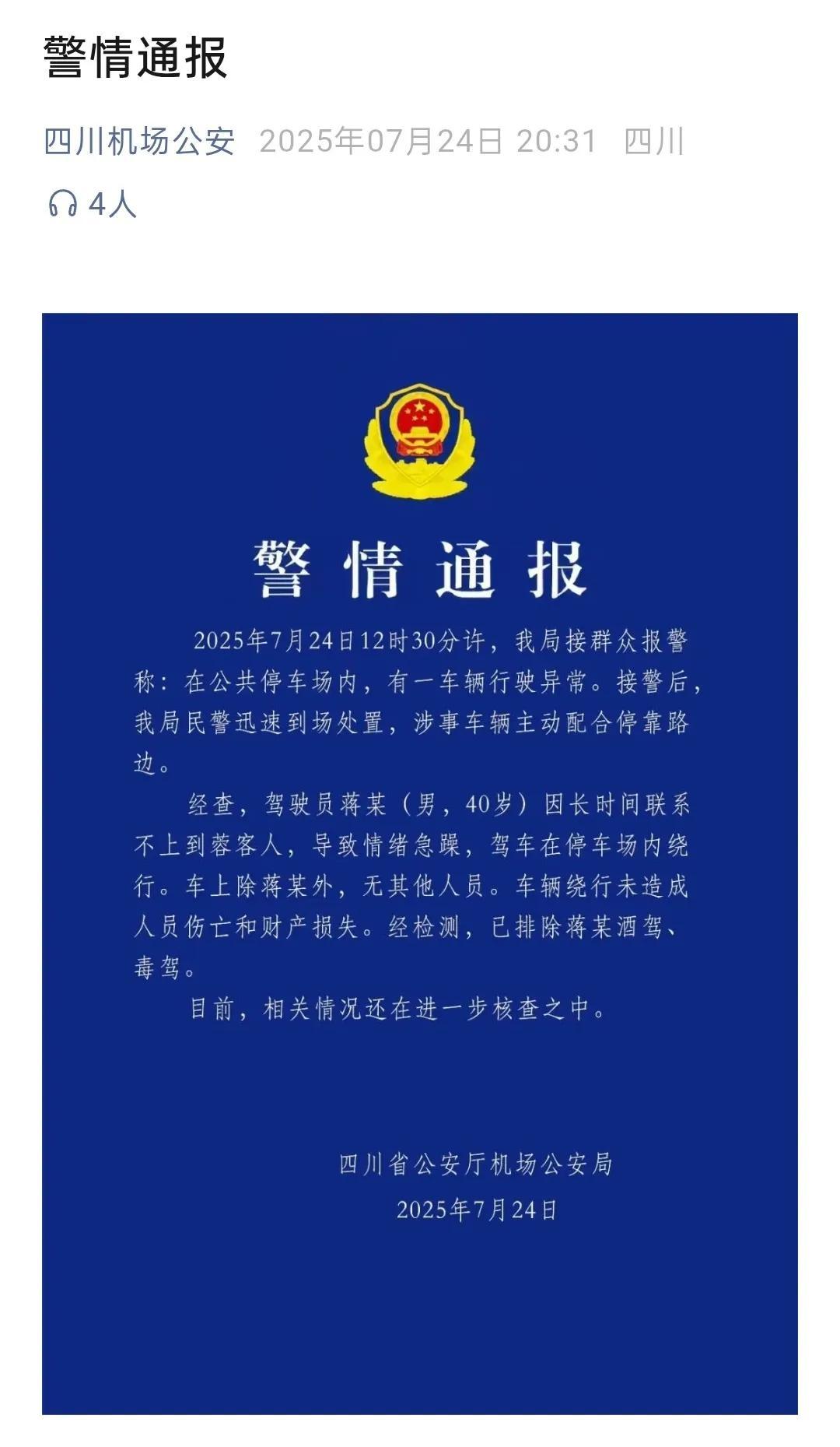 7月24日,四川省公安廳機場公安局發佈警情通報稱,駕駛員蔣某(男,40歲)因長時間聯繫不上到蓉客人,導致情緒急躁,駕車在停車場內繞行。車上除蔣某外,無其他人員。車輛繞行未造成人員傷亡和財產損失。經檢測,已排除蔣某酒駕、毒駕。