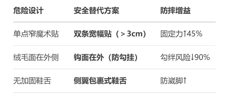 寬頭的鞋可以避免擠壓腳趾,而魔術貼比鞋帶安全性強 2 倍(防鞋帶散開絆倒)[2]。