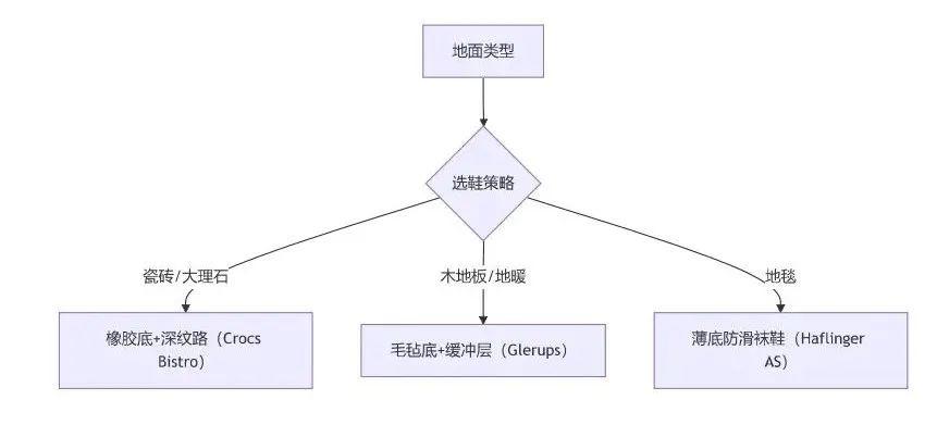 建議日常居家選擇適當的居家用鞋(後跟封閉包裹,足弓支撐穩定,溼滑地面防滑,一腳蹬方便)。洗澡時可穿防滑的拖鞋,其餘在家中的時間還是穿居家用鞋更好些。
