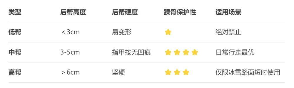 後幫需堅固包裹腳跟,鞋幫高度略高於踝骨(約 3-5cm),兼顧支撐與靈活[3]。