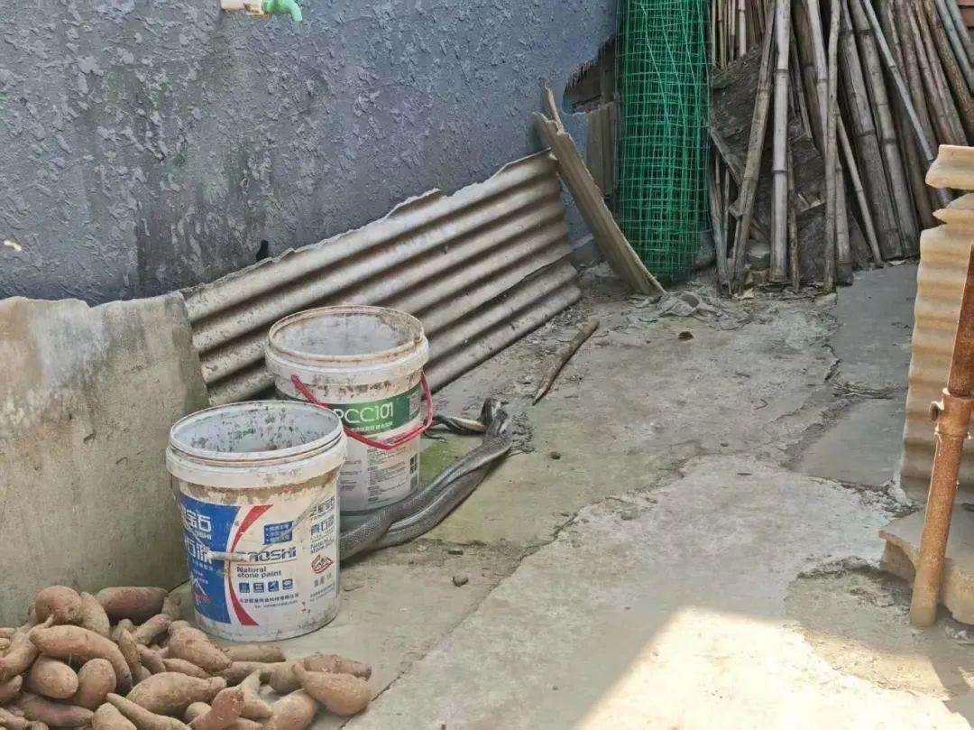近日,順義區張鎮張各莊村,兩條大蛇盤踞雞籠旁。圖源:順義消防