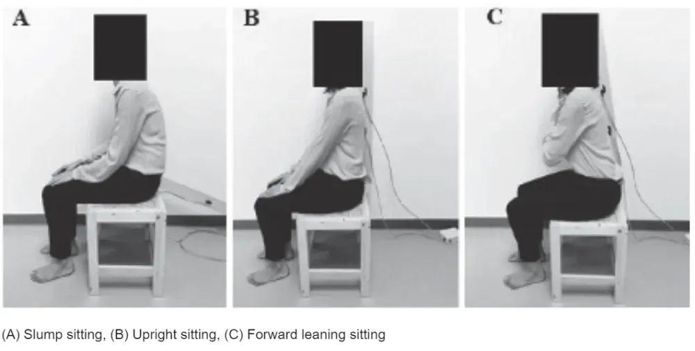 (a)懶漢坐姿(b)直立坐姿(c)前傾坐姿 證明不同坐姿。圖片來源參考文獻[14]