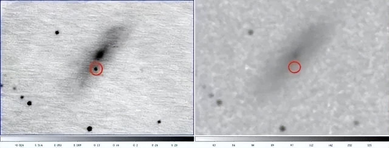 80 釐米望遠鏡拍攝的近紅外波段圖像。左圖:圓圈中爲超新星 SN2024xal;右圖:2MASS 兩微米全天巡天望遠鏡拍攝的近紅外波段歷史圖像 圖片來源:中山大學物理與天文學院