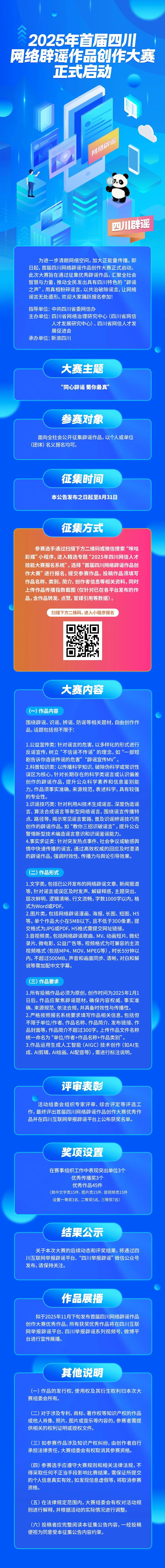 清朗網絡,以真相破謠言。2025年首屆四川網絡闢謠作品創作大賽正式啓動!即日起至9月30日,面向全社會徵集闢謠作品。無論文字、圖片還是音視頻,只要聚焦闢謠、識謠、防謠,用創意傳遞真相,即可參與。