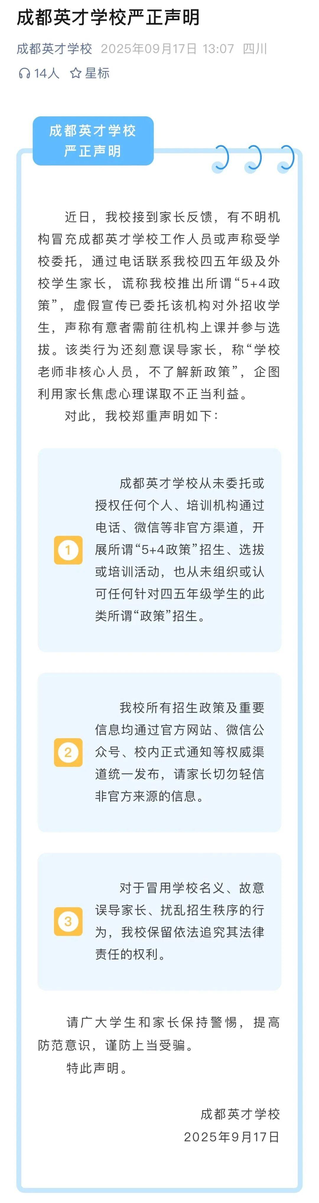 近日,成都英才學校接家長反饋得知,有不明機構冒充該校工作人員或聲稱受學校委託,電話聯繫該校四五年級及外校學生家長,謊稱該校“推出‘5+4政策’,已委託機構對外招收學生,有意者可前往機構上課並參與選拔。”