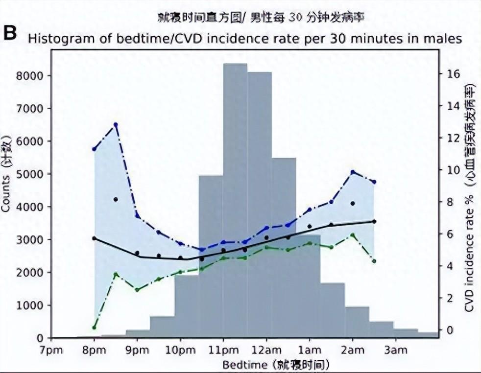 然後,研究人員對他們進行了平均時長爲 5.7 年的隨訪,發現有 3172 名(3.58%)被試患上了心血管疾病,包括:心肌梗塞、心力衰竭、慢性缺血性心臟病、中風和短暫性腦缺血發作。這些心血管疾病患者當中,有 43% 在凌晨及更晚睡,38% 在晚 11~12 點間睡,而僅有 15% 在晚 10~11 點間睡,4% 在晚 10 點前睡。