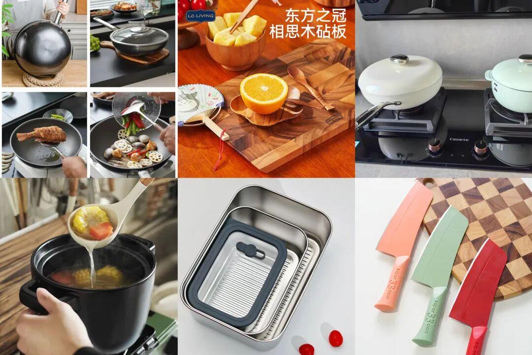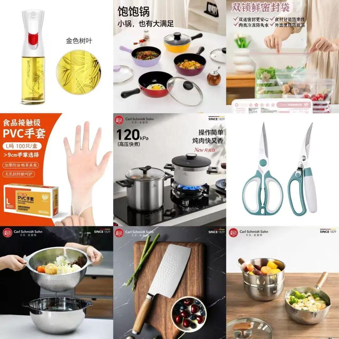 不僅有防黴抗菌的泰國相思木砧板、德國cs壓力鍋,還有德國三頭鷹不粘鈦炒鍋、泊喜多功能陶鍋、各種廚房刀具鍋鏟,噴油壺,瀝水籃,鈦杯,保鮮袋,保鮮盒,雪平鍋……