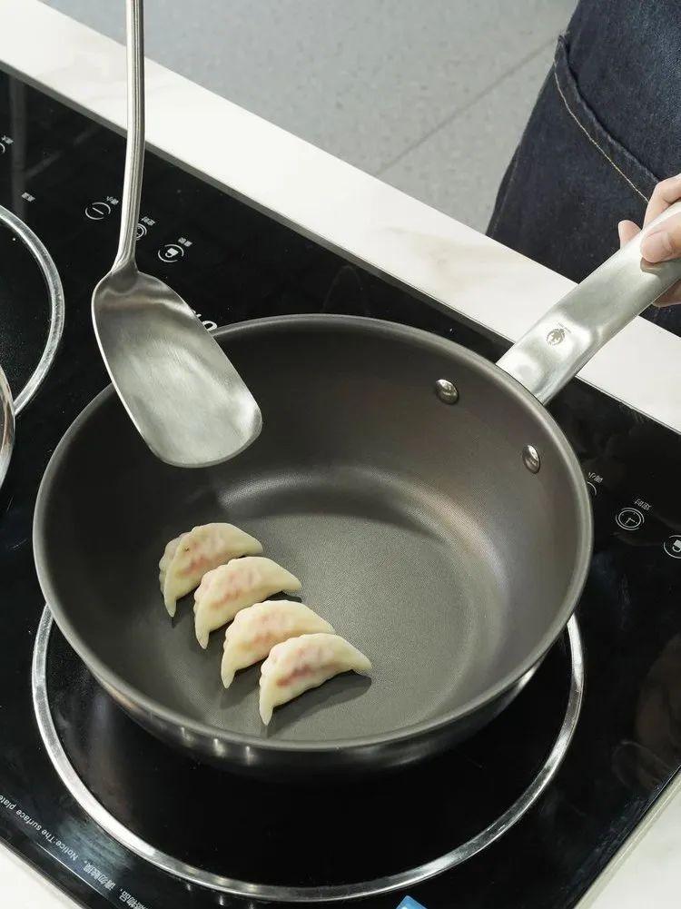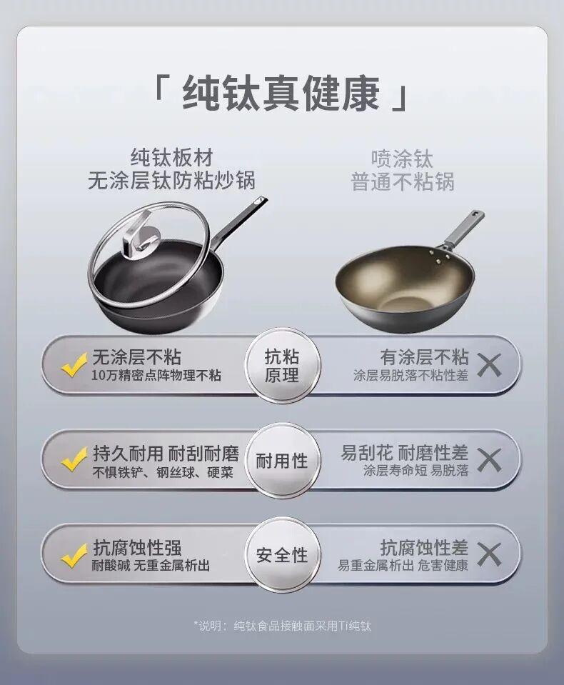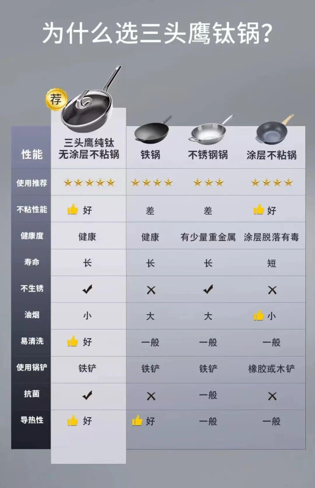 三頭鷹鈦鍋創新採用純鈦材質,食品接觸面由100%整塊鈦板一體衝壓成型,杜絕塗層脫落風險,實現真正的耐刮耐磨。