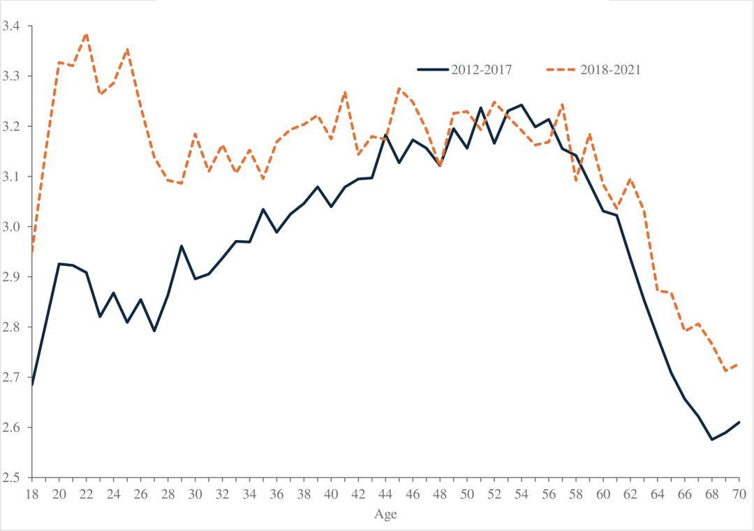 不過熬過這個時期,隨着年齡繼續增長,中年人都將迎來幸福感回升的階段,轉折大概出現在60~65歲這個階段,此後還會持續回升。