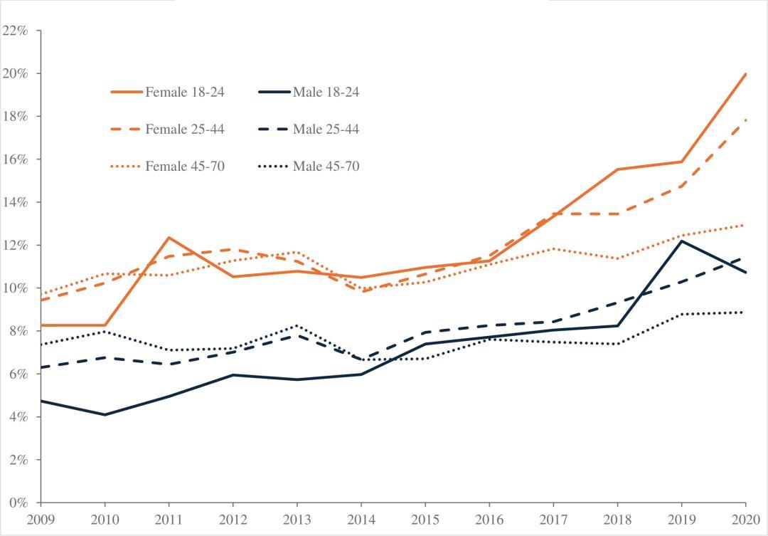 比如在2009年,不論性別,45~70歲年齡段的絕望人數佔比最高(包含了50~60歲這個階段),25~44歲次之,最後是年輕人(18~24歲)。但此後,年輕人的絕望感迅速上升,年輕男性(從3.0%增至6.6%)和女性(從5.6%增至9.3%)均增加了一倍左右。中年人羣的絕望感其實也有所上升,但上升速度較慢。相比之下,老年人羣中的絕望感則基本保持不變。
