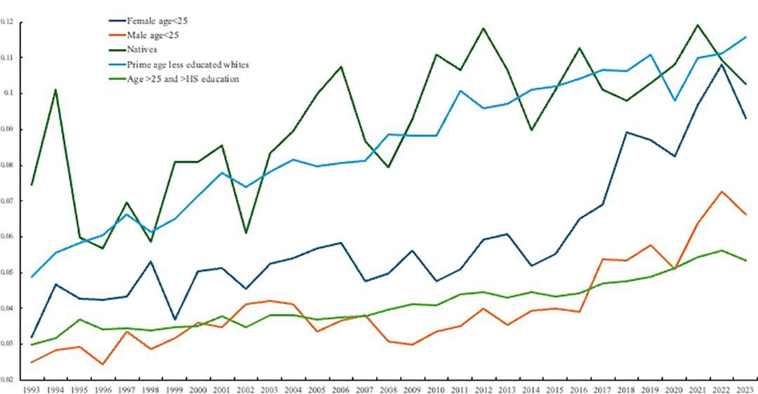 他們首先分析了美國疾病控制與預防中心(CDC)行爲風險因素監測系統(BRFSS)中公開的個人數據,發現在20年內,美國人羣中絕望情緒(近30天內幾乎每一天都心理健康狀況不佳)幾乎翻了一番,從1993年的3.7%(研究樣本涉及10多萬人)上升至2023-2024年的6.7%(研究樣本超過45萬人)。這種變化在25歲以下的人羣最爲明顯,有絕望情緒的人數比例從1993年的2.9%上升到2023年的8%。
