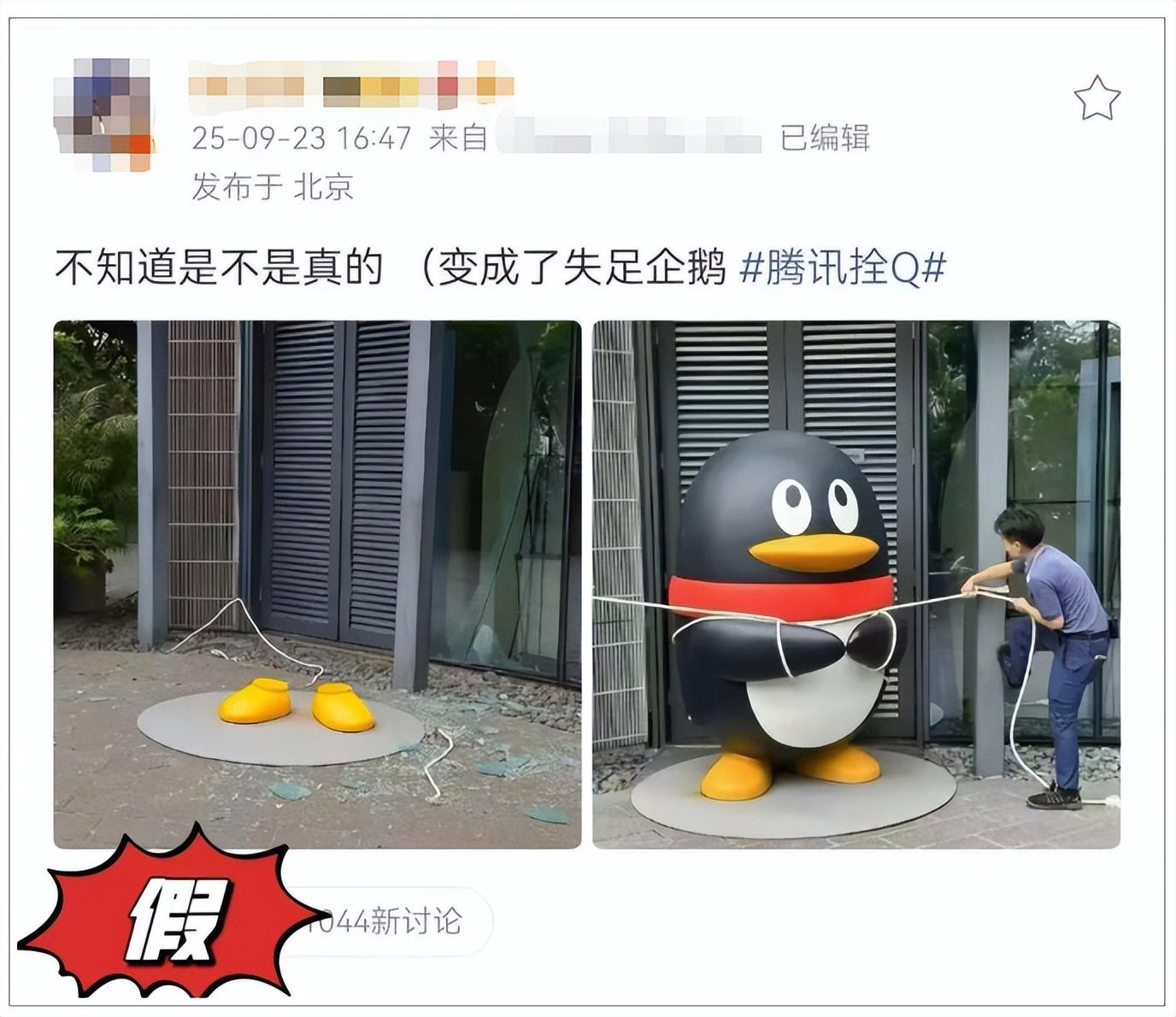 9月23日,騰訊公司爲了防禦颱風,將門口的企鵝用繩拴了起來。而有網民傳播的圖片顯示企鵝只剩雙腳,上身被風吹走。騰訊QQ回應:“鵝拴着呢,穩穩的。”