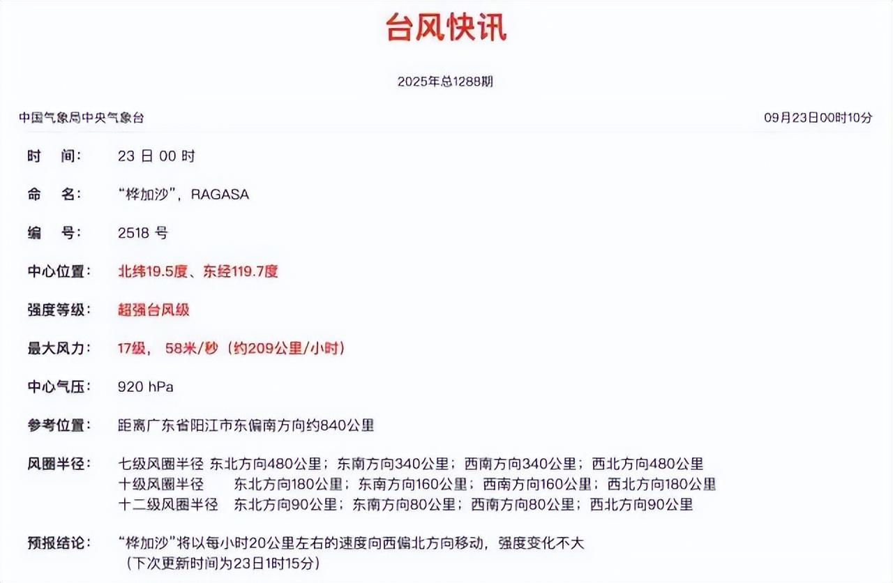 據中央氣象臺數據,9月23日0時,“樺加沙”最大風力17級,風速58米/秒(約209公里/小時),中心氣壓:920hPa,七級風圈半徑爲340~480公里,十級風圈半徑爲160~180公里,十二級風圈半徑爲80~90公里。