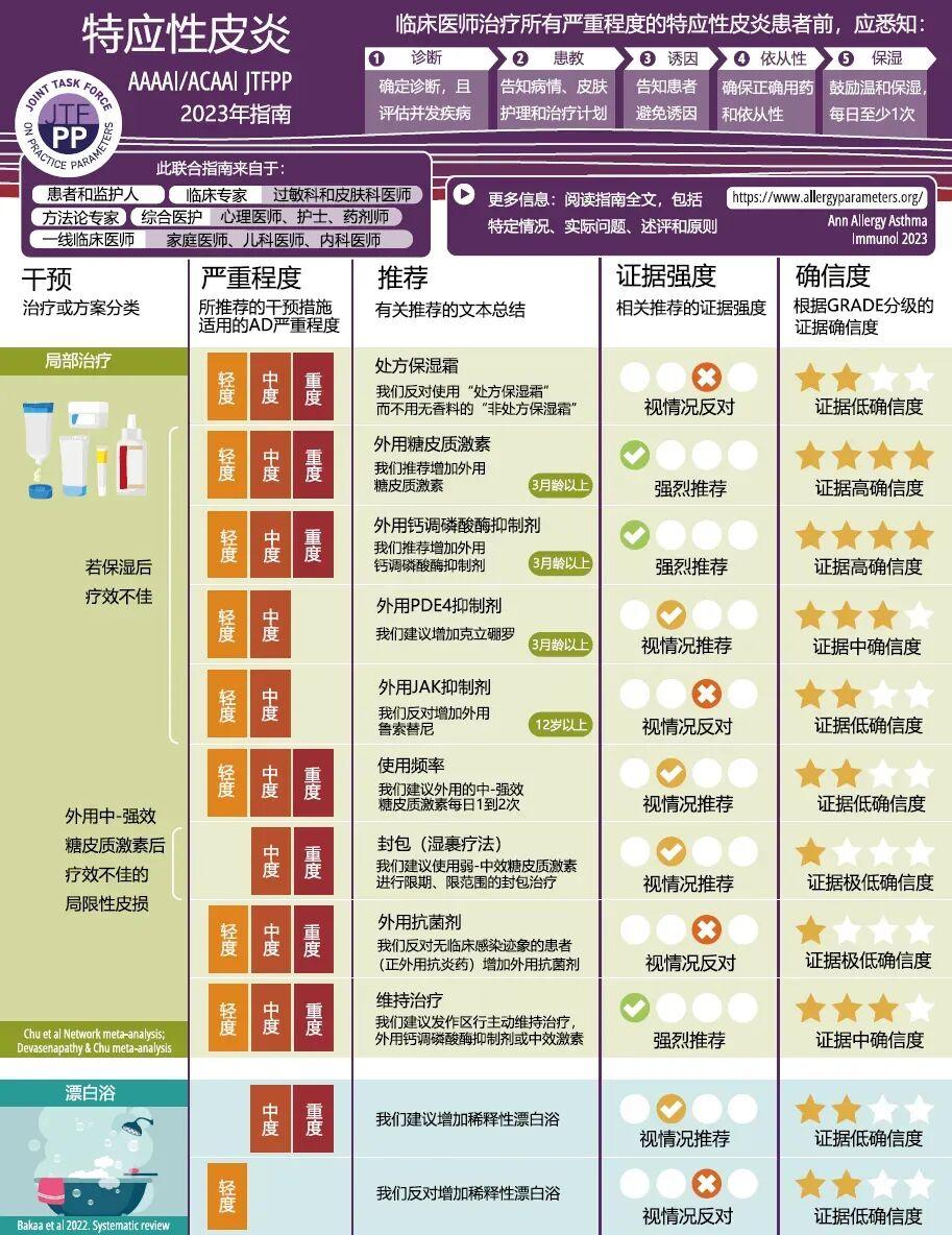 美國過敏、哮喘與免疫學會/美國過敏、哮喘與免疫學院聯合工作組實踐參數委員會(AAAAI/ACAAI JTFPP)發佈的《 2023 年的特應性皮炎管理指南》也有相關內容: