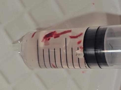 5)更換注射器內自來水,獲得乾淨清爽的“蝦線”血凝塊。