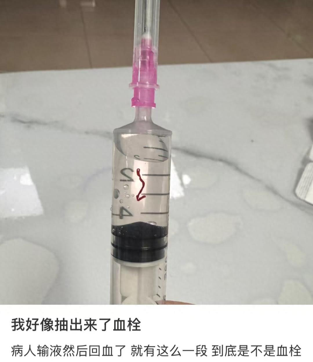 而血管裏真正的血栓是無法使用常規注射器抽出的,網傳的“蝦線”都是留置在人體內的導管內產生的血凝塊,只要不推進血管裏(或只在表淺靜脈裏),不會有嚴重危害。