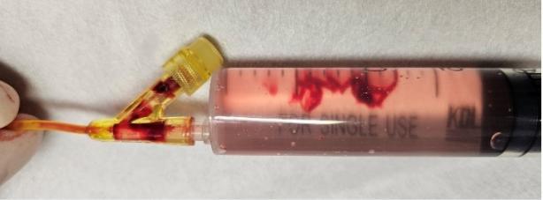 4)在45s左右,回抽1ml注射器,發現雞血部分凝固;