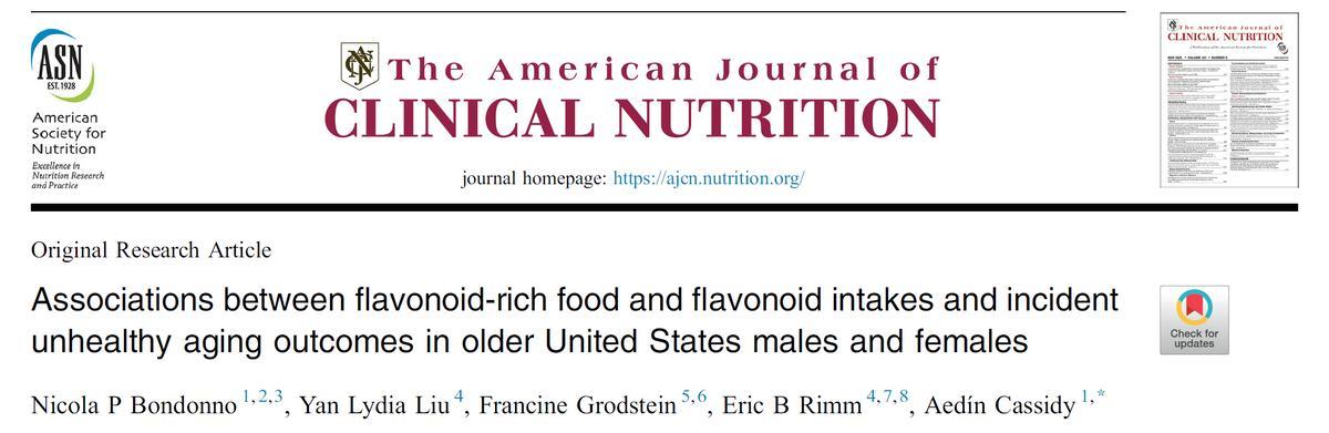 [1] Bondonno, Nicola P., et al. "Associations between flavonoid-rich food and flavonoid intakes and incident unhealthy aging outcomes in older United States males and females." The American Journal of Clinical Nutrition 121.5 (2025): 972-985.