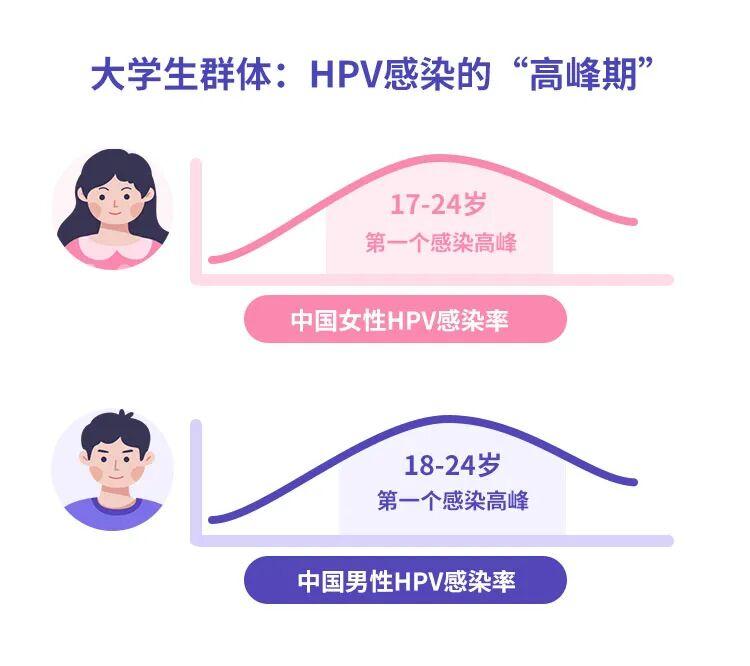 從小樹林裏親密的擁吻,到快捷酒店裏甜蜜的相擁入眠,美好的背後,病毒也隨着未經防護的親密接觸悄然傳遞開來。根據相關數據,大學階段正是感染 HPV 的高峯期:一項2013年多中心、基於人羣研究顯示,中國女性HPV感染率第一個高峯出現在“17-24歲”;一項2024年回顧性研究則顯示,中國男性HPV感染率第一個高峯出現在“18-24歲[3,b][4,c]。