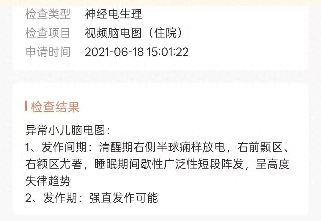 2021年6月,小檸檬在進行常規的視頻腦電圖複查時出現了新的變化,檢查結果顯示有“高度失律”。我自然是不明白這四個字意味着什麼,兒童醫院的醫生卻很激動,如臨大敵。她告訴我,視頻腦電圖出現高度失律是嬰兒痙攣症的典型檢查表現。嬰兒痙攣症是一種罕見的難治性癲癇,常起病於4~6月齡,典型症狀是點頭擁抱(由於頸部肌肉、上肢肌肉短暫而突然的收縮,導致嬰兒出現像點頭、擁抱的特定姿勢),預後極差,會有智力等方面的倒退。