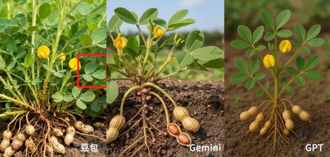 其實不同的AI,畫花似乎都沒有完全準確的,區別只是大大離譜還是小小離譜。這裏我們比較了一下,讓豆包、chatGPT和Gemini同時畫出大豆的寫實照片。