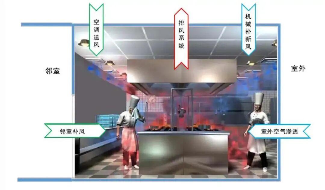 2022年,西安建築科技大學學者王京超在《商場建築排風方式對室內污染物擴散影響研究》一文中對多個商場走訪調研發現,商場餐飲廚房的空氣交換,除了依靠臨室補風和室外空氣滲透,還依靠設置在頂部的機械空調送風和機械補風引入新空氣,再通過排風系統吸走室內空氣,從而實現室內空氣循環。