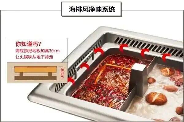 海底撈告訴壹讀,整個地排風系統分爲:無煙堡四周排風,專用電磁爐火力調節,專用變頻控制地排風系統及油煙淨化器系統。