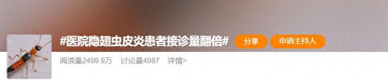 近日,一則“醫院隱翅蟲皮炎患者接診量翻倍”的新聞登上熱搜。濟南多個區域出現被稱爲“飛行的硫酸”的隱翅蟲襲擊,不少市民因徒手拍打、誤觸蟲體而引發皮膚水皰、破潰等症狀。據山東大學齊魯醫院皮膚科消息,近期隱翅蟲皮炎患者接診量較以往增長一倍,提醒廣大市民注意。