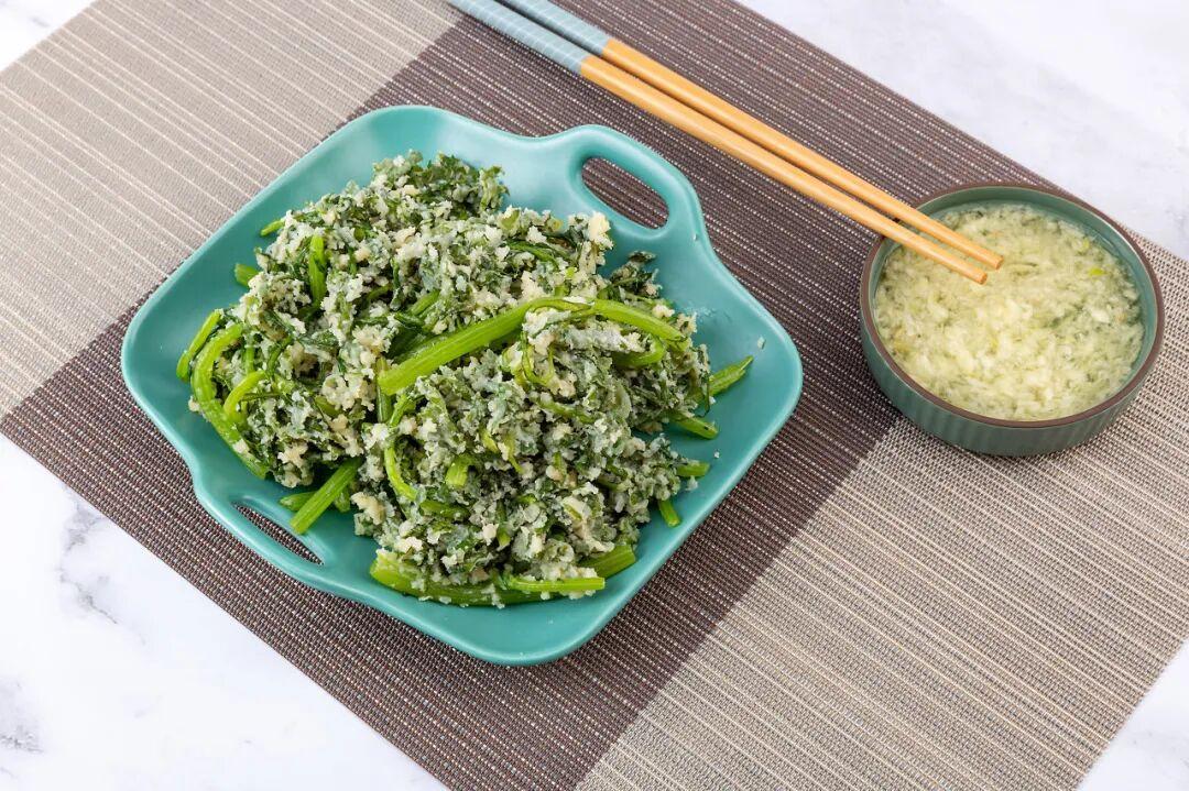 裹粉的量太多,會使蒸好的菜粘在一起,口感不佳;裹粉的量如果太少,菜葉直接接觸蒸汽,容易發黃、發軟,也會影響成品的效果。所以,在裹粉的時候一定要遵循“少量多次”的原則,用翻拌的手法,讓菜葉、菜絲均勻地裹上一層薄薄的普通麪粉或玉米麪粉,以看不到大片的葉面但能看到蔬菜的顏色爲宜。