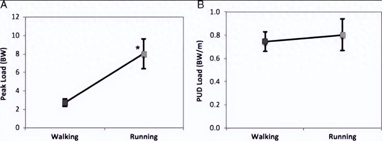 跑步和走路膝蓋的峯值衝擊力和單位距離負荷,圖片來源:參考文獻1