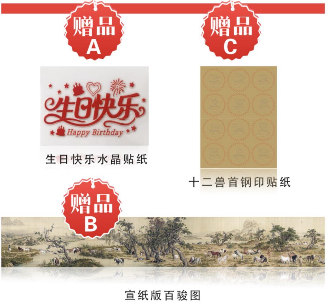 現在下單,還額外給:十二生肖的12枚鋼印貼+1枚生日貼+一幅百駿圖,全部免費給!