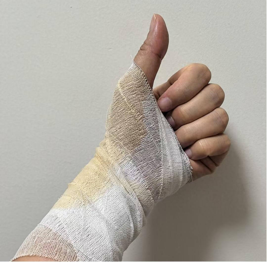 右手腕最嚴重的時候,黑色痕跡是外敷藥丨作者供圖