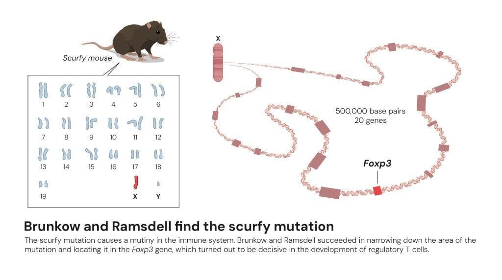 布倫科和拉姆斯德爾在20個候選基因中鎖定了導致scurfy突變的罪魁禍首Foxp3基因,事實證明這就是調節性T細胞的總開關 | The Nobel Committee for Physiology or Medicine. Ill. Mattias Karlén