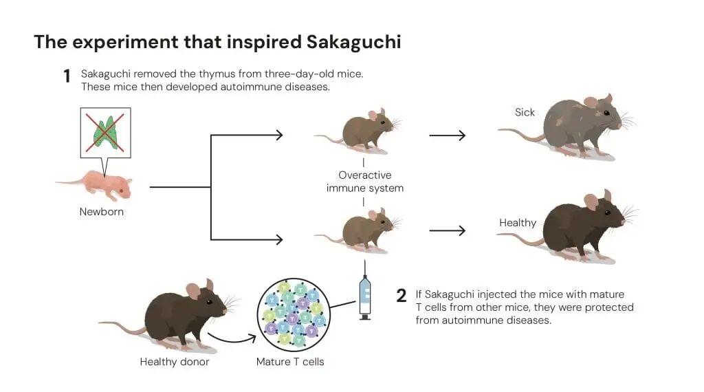 他受到一項早期實驗的啓發:爲了研究胸腺在T細胞發育中的作用,研究人員切除了新生小鼠的胸腺。他們原本以爲小鼠會產生更少的T細胞,免疫系統會變弱。