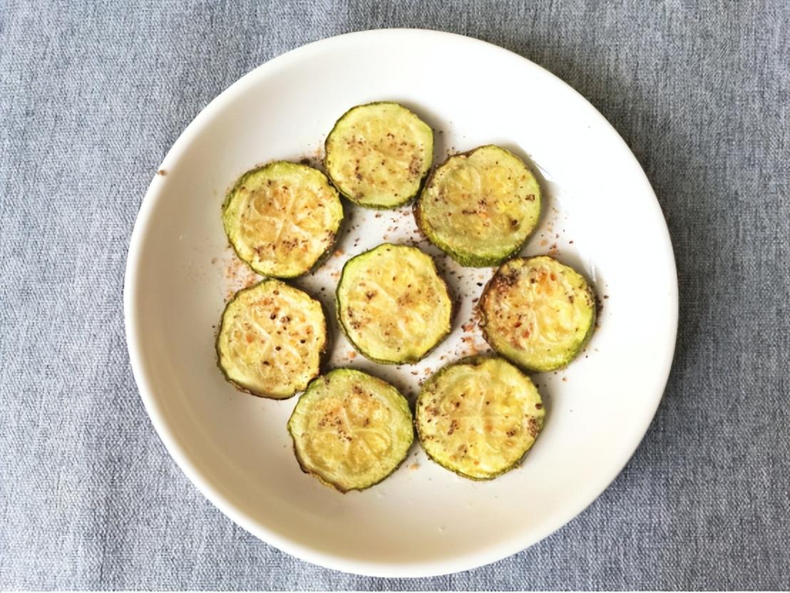 將西葫蘆洗乾淨後切厚片(約 1 指厚),噴少量油,放入空氣炸鍋 180℃ 先烤 10 分鐘,再翻面繼續烤 10 分鐘,出鍋後可以撒上自己喜歡的調味料,比如燒烤料、孜然粉、黑胡椒粉、辣椒麪等,直接開喫。