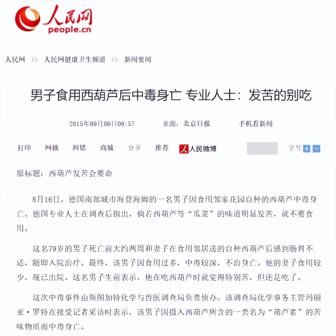 2015 年就有一則報道稱:德國的一名男子,因大量食用鄰居自種的發苦的西葫蘆後,中毒身亡。